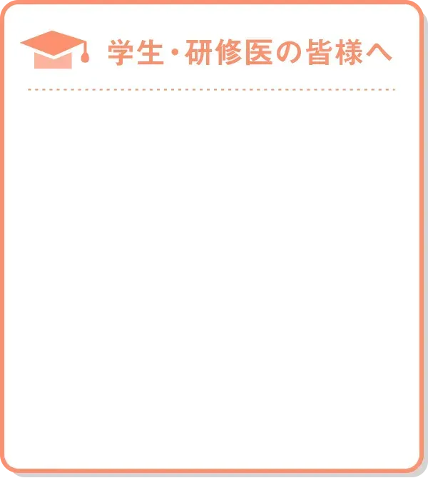 幅広い領域にわたる指導医資格者により、濃密かつ効率的に専門医指導を行います。同時に、日常の患者さんに最先端の解析技術を適用するスタイルでの臨床研究により、無理なく医学博士号の取得につなげます。これらにより、最新の医学知識、臨床技能を備えた、21世紀に相応しい内科医療を推進します。